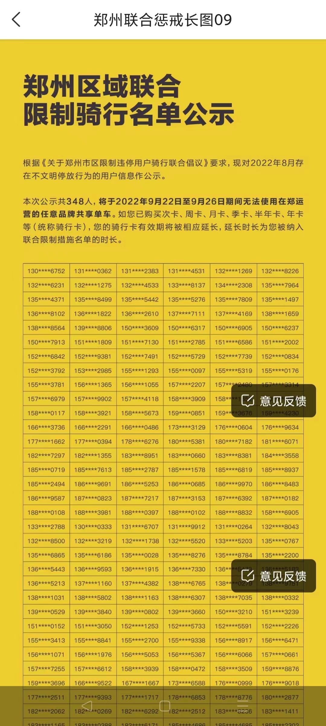 如今,該行動已執行一個月。大河報·豫視頻記者從哈啰獲悉,近日,鄭州市三家共享單車公司已按要求向負責執行的第三方公司提交了亂停亂放5次以上的用戶名單,經過三方整合和數據脫敏,最終被限制騎行的用戶名單已經在哈啰App內進行了公示。